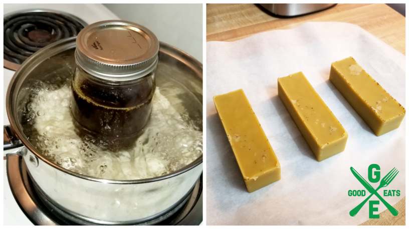 - After 2 hours you will take it out of the water and strain it. You can use a coffee filter or strainer to make this happen. You can use cheese cloth from the beginning as well, but it may have a hard time fitting in the jar depending on what kind you use. After filtered, put it a mold and let set up in the freezer for 30 – 45 mins. Once you do that, you’re finished. If you are using the butter right away, you don’t have to worry about this last step.