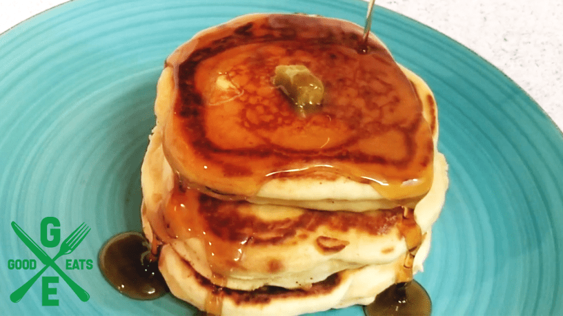 In a large bowl mix together the flour, baking powder and salt with a wooden spoon. Set to the side. In a smaller bowl crack in the egg and pour in the milk. Add the melted butter and vanilla essence to the egg and milk and use a fork to mix together until everything is well combined. Make a well in the dry ingredients and pour in the wet. Fold the batter together with a wooden spoon until there are no longer any large lumps. To cook the pancakes heat a heavy based pan like cast iron or any frying pan you have available over medium low heat. When the pan is hot add a small amount of butter and ⅓ cup of the pancakes batter. Cook the pancake for 2-3 minutes each side. Repeat with remaining batter. Recipe makes 4 pancakes, to make more just double or triple the ingredients. Serve the pancakes stacked high with butter and maple syrup. Enjoy.