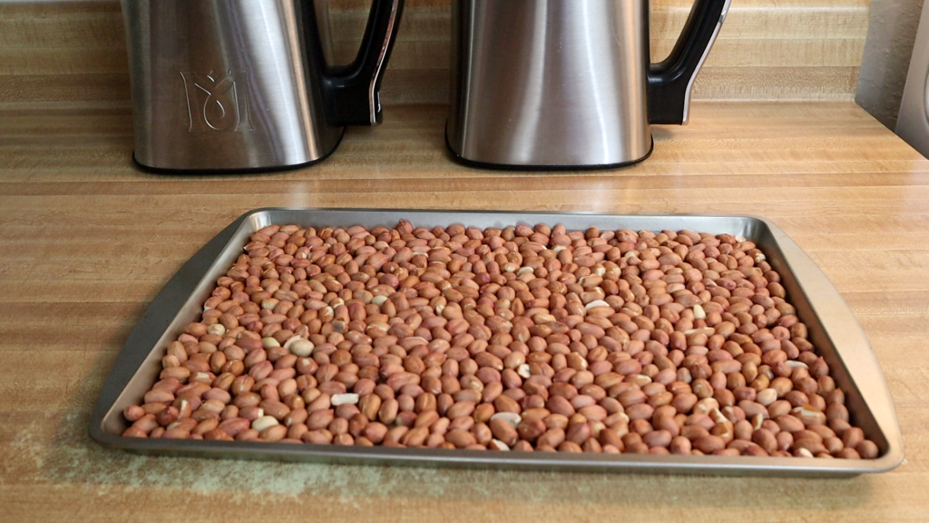 2. Place peanuts in a single layer on a baking sheet. Place in the oven and roast for 10 minutes or so, until nuts just begin to turn brown, you hear them pop, and you get the scent of popcorn.