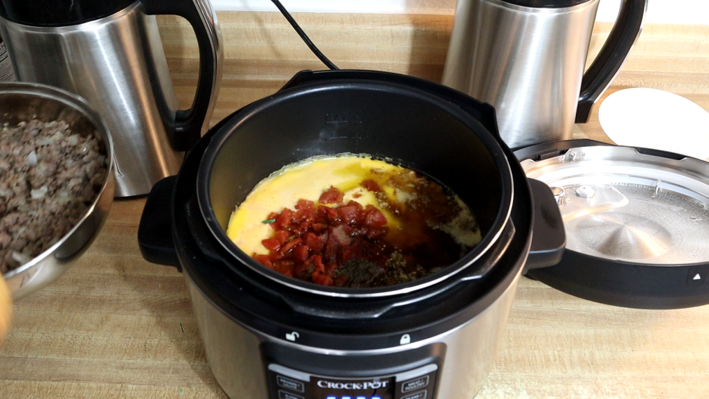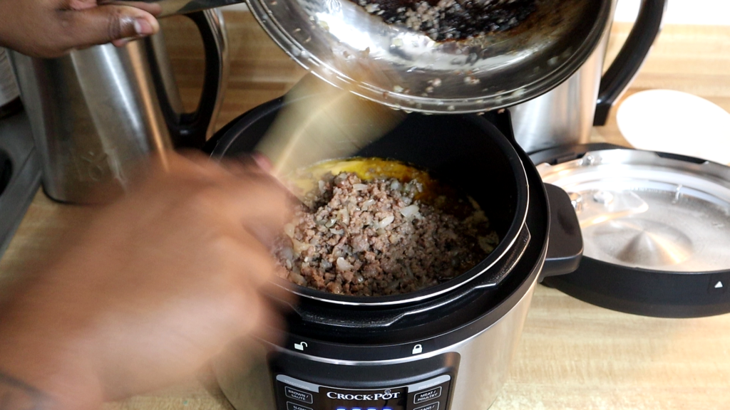 - Put all the ingredients inside the Crock Pot, except for the sausage and onions